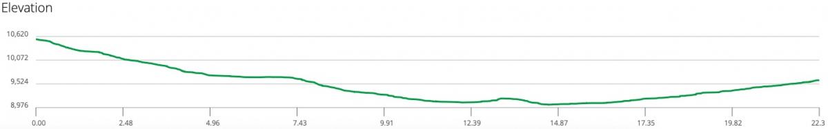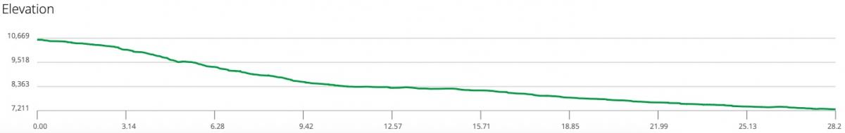 0 miles, staying at the hotel; 28 miles (with +372 ft of ascent and -3708 ft of total descent) bicycling from Vail Pass to Edwards (the first 10 miles is steep enough that there is very little pedaling); or 46 miles (with +500 ft of ascent and -4237 ft of total descent) with the final 21 miles continues on a slight downhill grade. [The short route is primarily downhill on paved bicycle paths the longer route also utilizes paved secondary roads.]